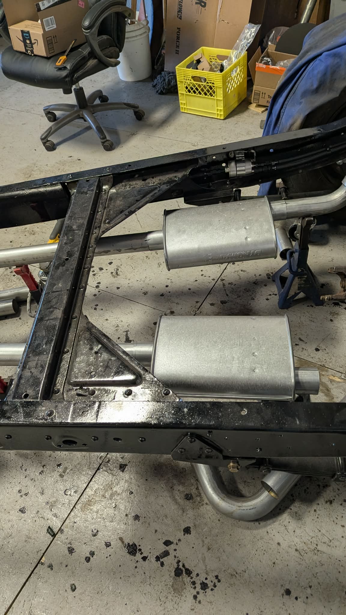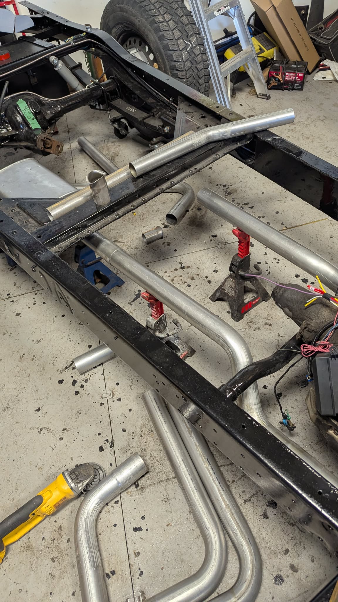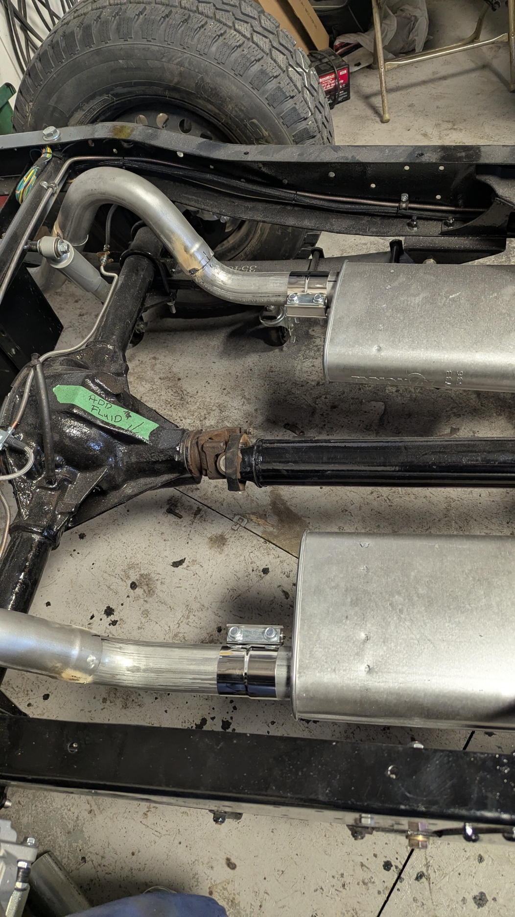 Went in today and found it to be EXHAUSTING !! Just kidding !! Started to place things in position and lay all the parts out to complete the exhaust system. I had ordered the Dynomax 17733 Super Turbo mufflers but will install them so they can be changed out if needs requires. It was like putting a puzzle together and a lot of measuring and cutting. Starting from the front, I got the mufflers in position then figured out how to get the exhaust over axle and route it back between the fuel tank and springs. Now looking at it, it really did not take that long as the hardest part was doing the one side. The other side went quickly as I just had to remove the back parts and made them the same as the first side. Everything is loose as I want the Driveshaft installed to make sure there is the proper clearance for everything.