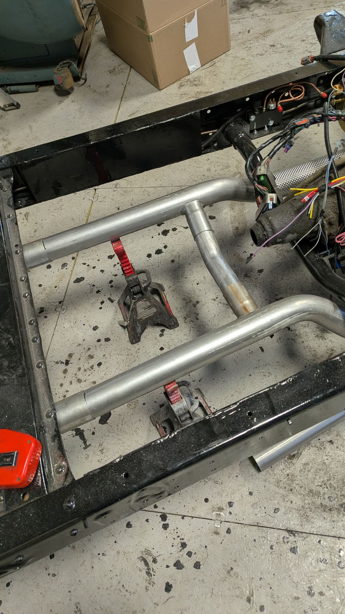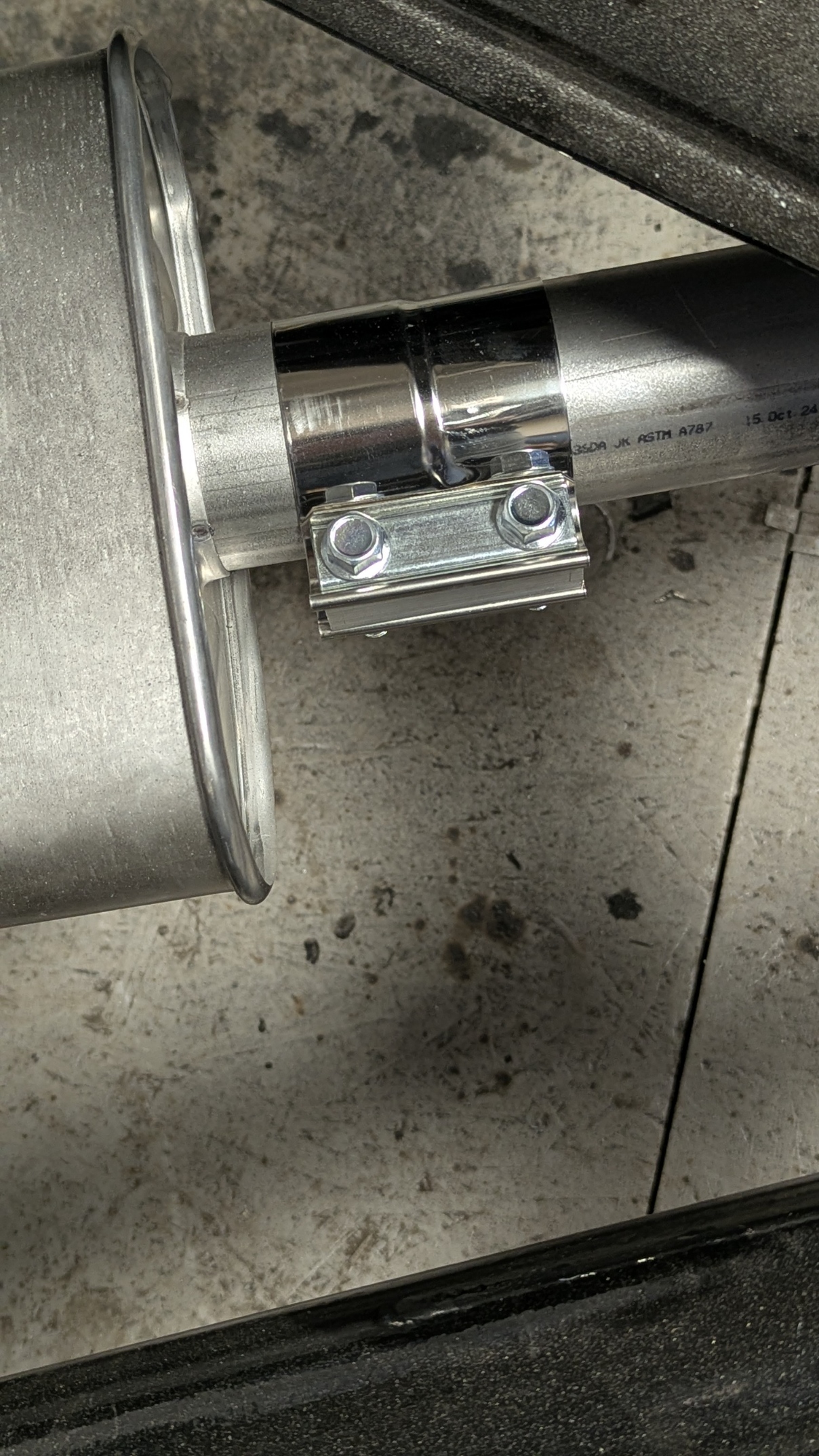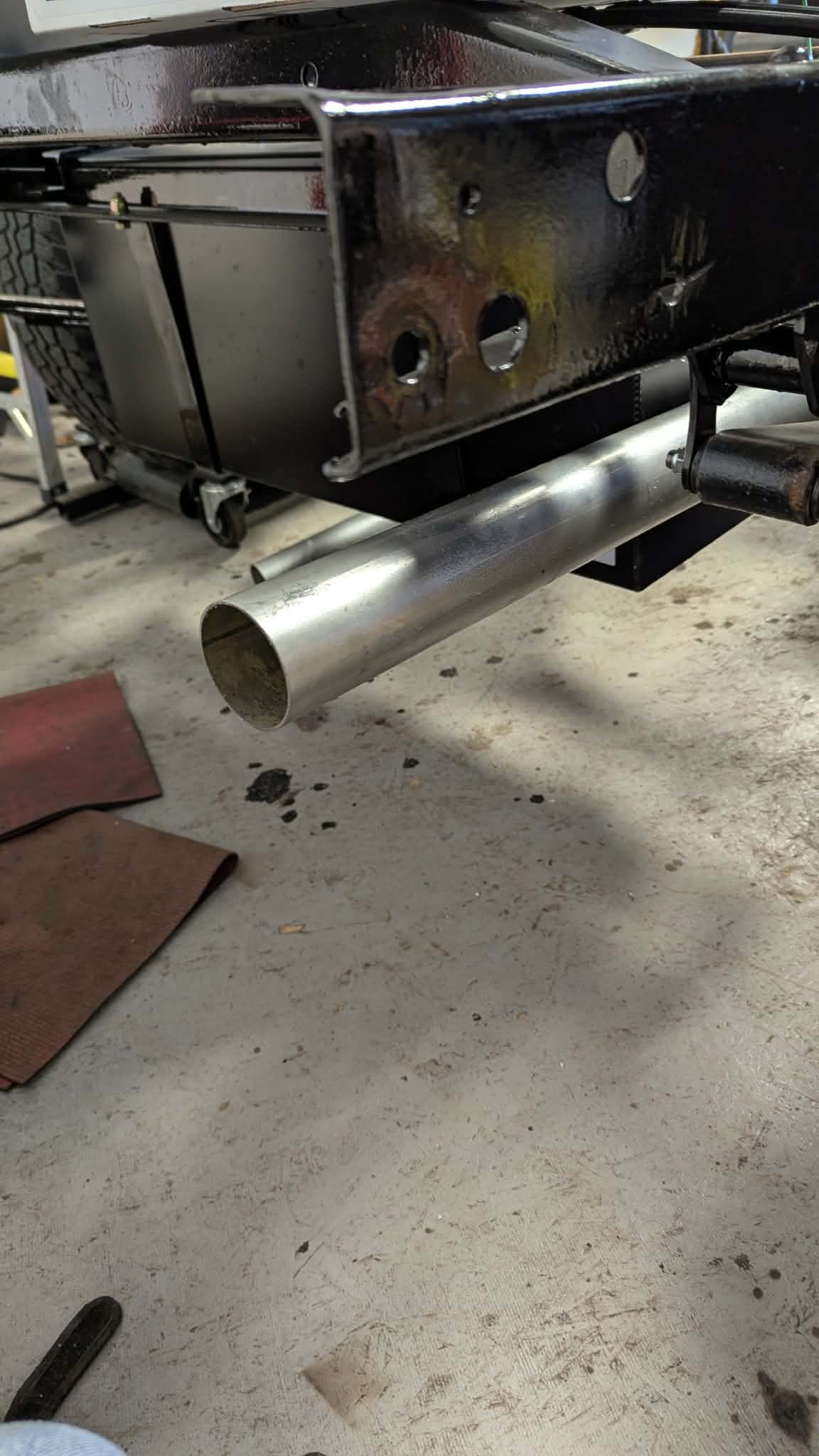 I got the Flowmaster 2.5″ Exhaust system and thought I would tackle some of it until the decision of the right muffler to put on it. Of course to start it off, you have to start with the most difficult. Headers came with a V-Clamp flange and a small extension piece. I had to figure out the angle to mate together and at the right angle. After some Trial and Error, I discovered I just need to adjust the length of the 45 degree tubes. Once I trimmed and trimmed, I finally got the length I needed. Welding the two pieces together proved to be quite the challenge and one was 16 Gauge Aluminized Mild Steel and the other was chrome cover and a lot thinner. Practiced welding on a scrap piece so I could get the wire feed and heat close. My setting was great for the 16 gauge but a little hot for the thinner metal. Some more Trial and I got it so the two pieces were welded together. Kept checking with a light to make sure it was sealed all the way around. Set the tub in place and found the angle slightly off but that was easily fixed by adding a cut into the top side half way down and then welding it together. Figured out where the O2 sensor bung needed to go and drilled the hole then welded in place. Don’t look close at the welds as I am definitely not a Pro. The other side took me way less time as I know knew what I needed to do. Welding went a lot faster with one small burn through. Mounted both pipes and added the next extension piece and both sides are very close. You can see where the balance tube will go. I will place that once I know where the mufflers will sit.