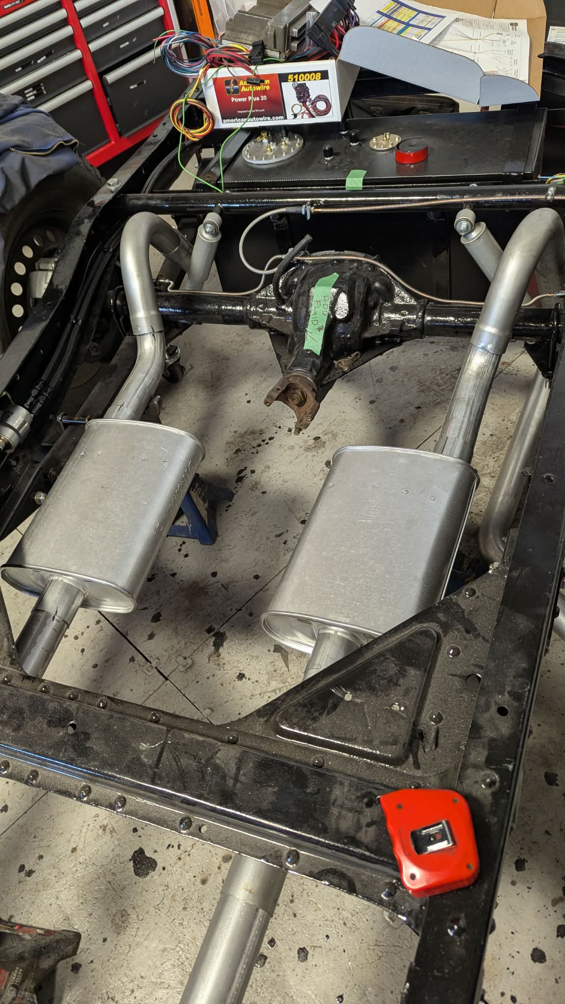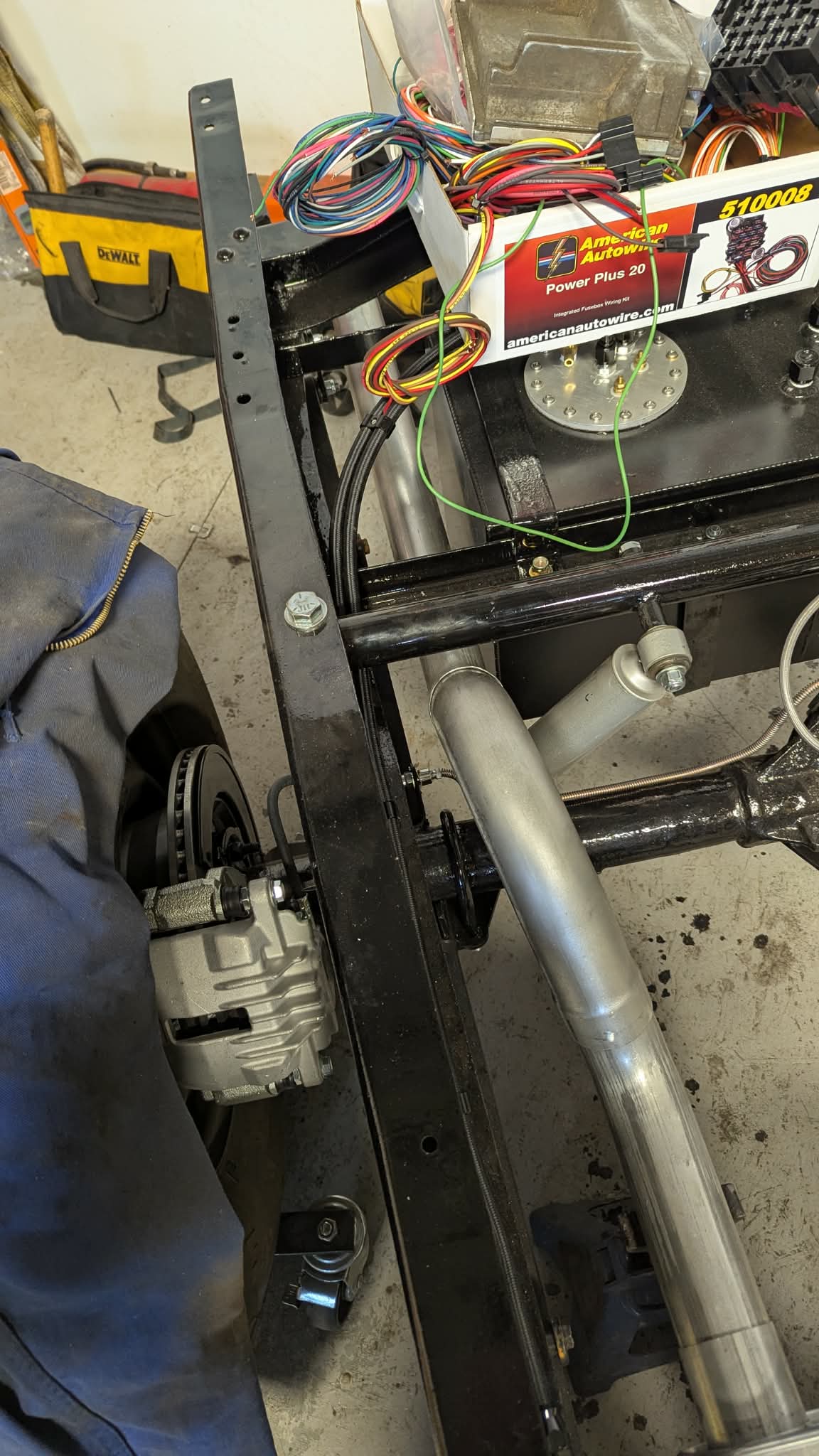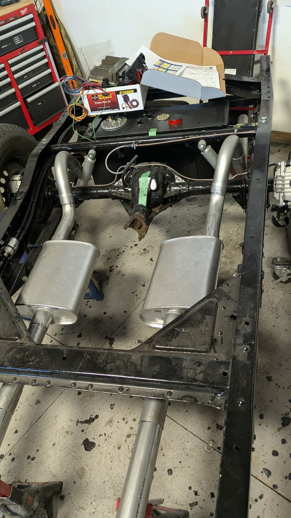 More Parts Showed up !! Especially the WIRE HARNESS by American AutoWire. Lots of fun now !! Due to the way this vehicle will be done, I am making separate harnesses for rear part so it can be run inside the frame and not interfere when it is at the body shop. Made up the rear harness, installed shielded conduit, taped it and ran it inside the frame. Then I secured it all along the way. The rest will will take some integration with the Engine wire harness.