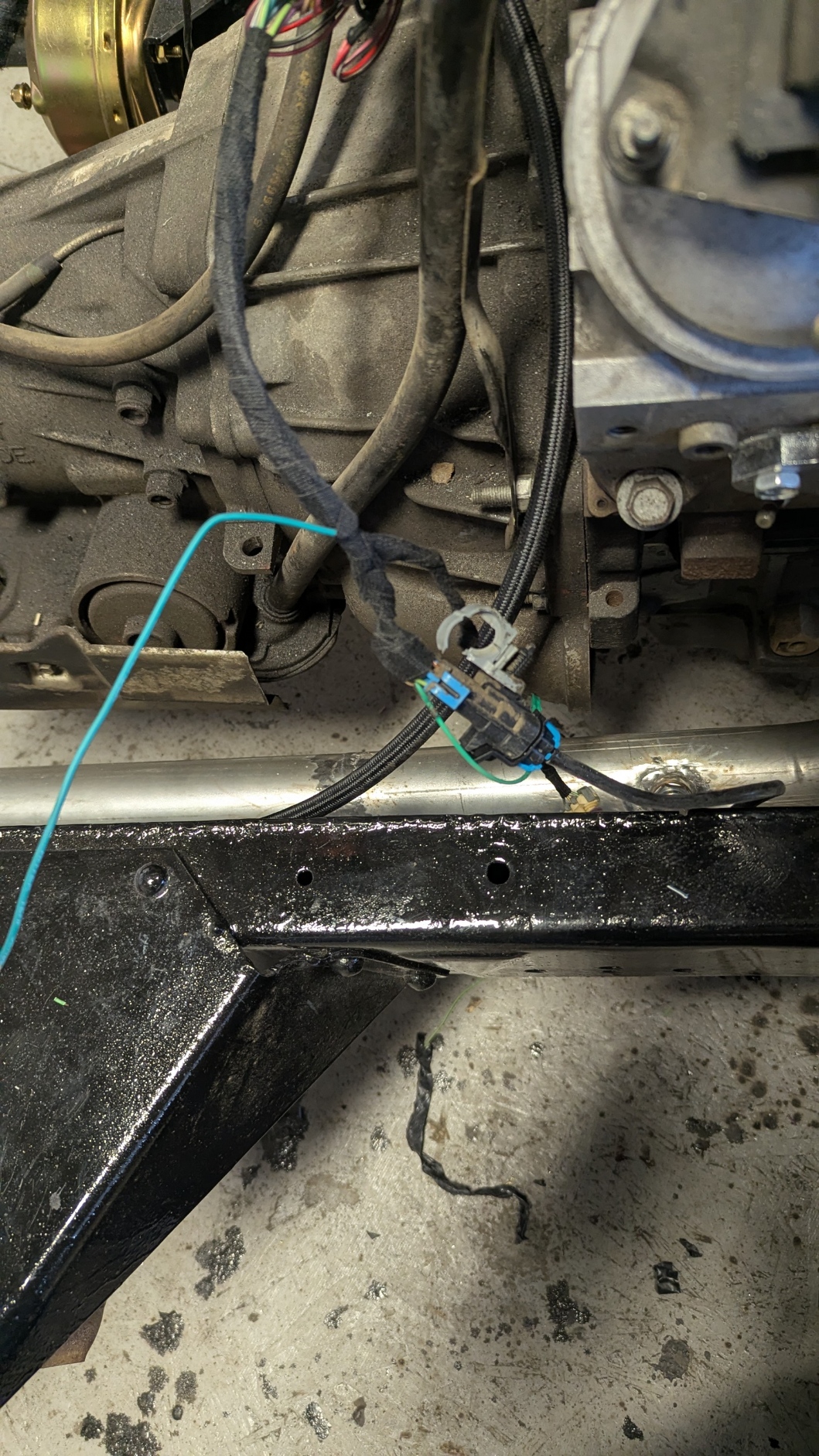 Then I looked around and saw some of the wiring will need to be customized to my liking. I could to the transmission wire harness for now. Took about two feet out of the wiring. All crimped with seamless butt connectors and heat shrink to seal the moisture out. Then taped it all up. Looks way better.