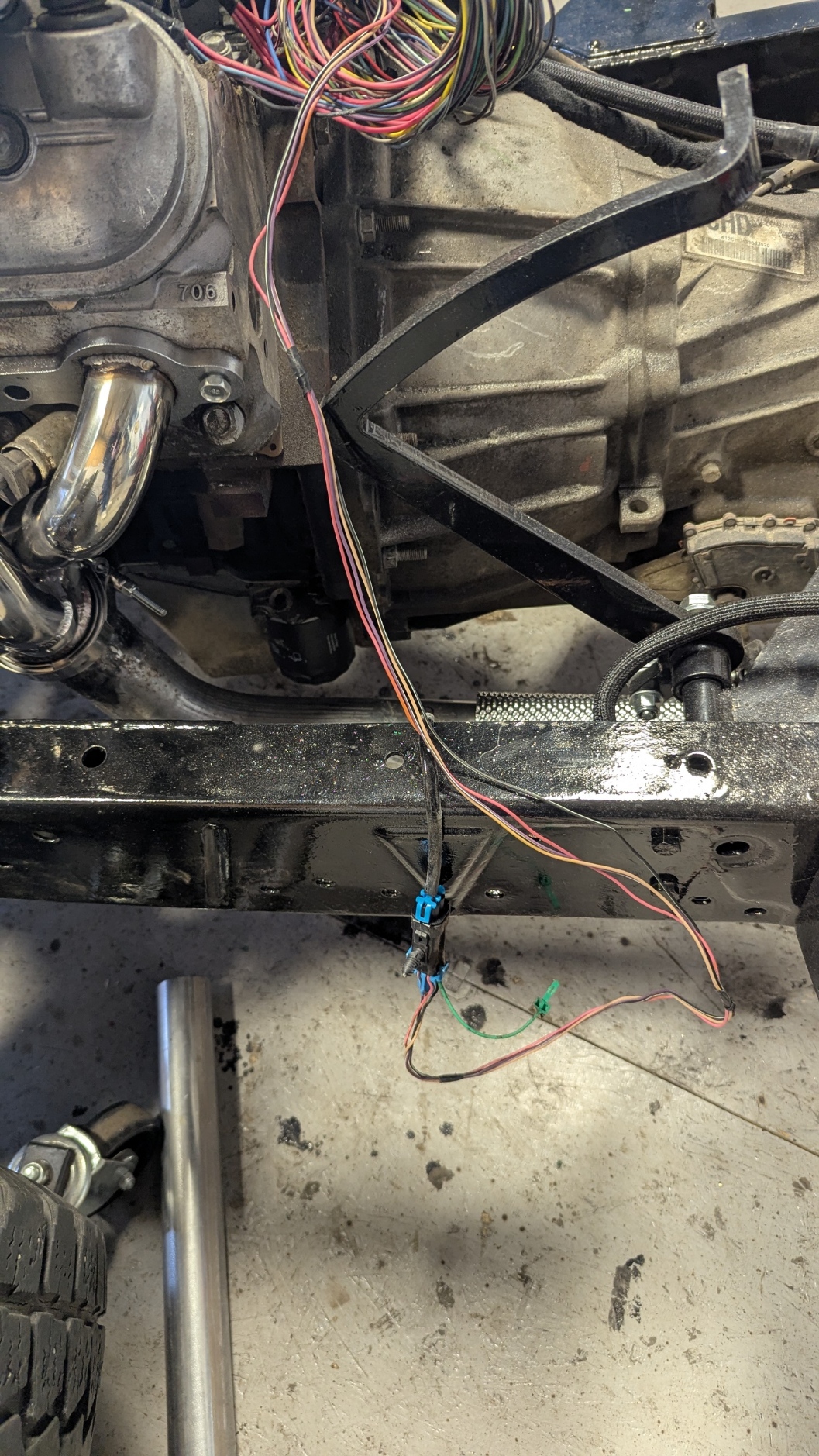I am still waiting for some parts for the rear brakes and the New Wire Harness. So while I was in a slight holding pattern, I thought I would lay out the Engine/Transmission harness I had built by Cory Lim in Beaumont to see how everything will lay. Remember you have a Dodge Mechanic working on a Chevy. I know where most of the plugs where they went BUT found out the Cam and the Crank sensor both use the same connectors. Weird !! I have all the Sensor, coils and injectors connector in place. Trans wiring looks correct but I have a few questions for Cory to confirm everything. Also checked the Driveshaft length and it looks like a 50″ shaft will do. The big aluminum one I got with the Transmission will not work. Need something smaller diameter. Will be a good conversation with the Driveline shop.