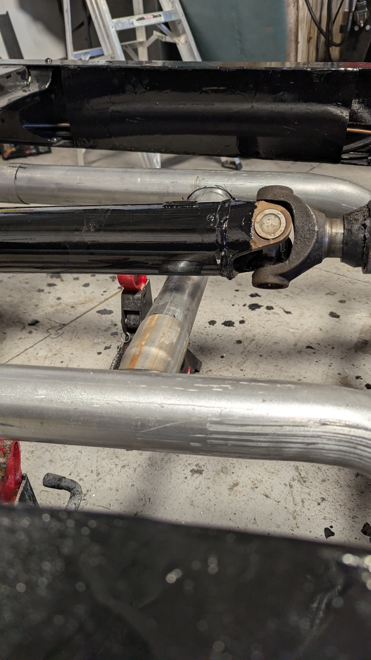 I did connect the steering shaft and it does look like it will fit BUT there is also no Exhaust in place which I am sure will make me add an extra joint in there to get the clearance. Just another hurdle to go over but all the fun of Hot Rodding !! Installed the Driveshaft to see if the angles were OK. Should be good but may have to go to a smaller diameter driveshaft. I will confirm this when I go to put the driveshaft in.