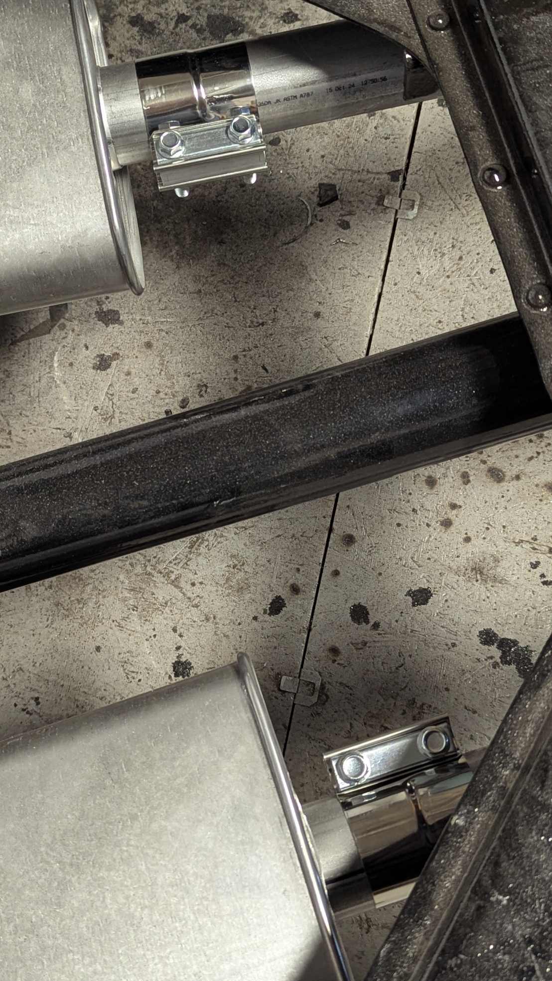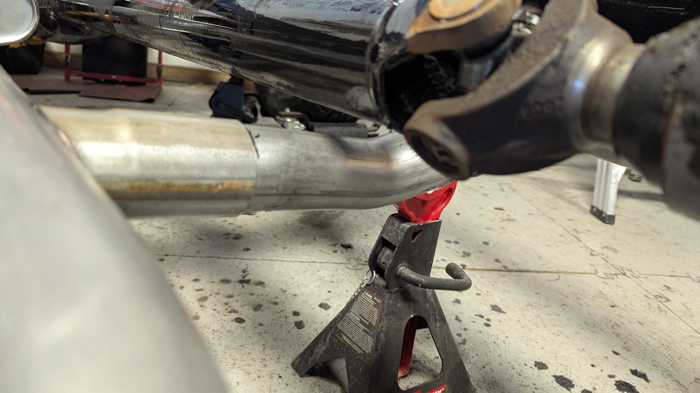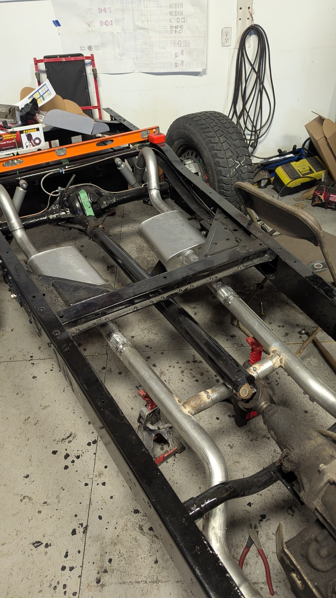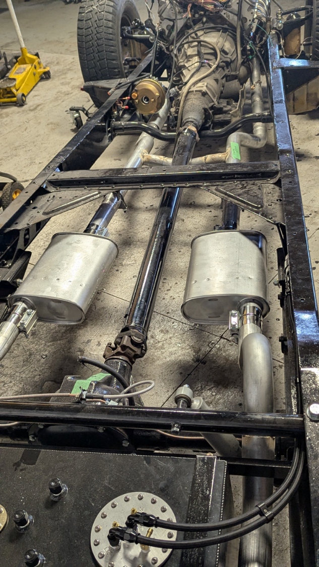 Day 56 was another exhausting day. Murray the owner dropped by with the driveshaft so I could confirm clearances. Discussed progress and what would be happening after the exhaust is done. Once he left I aligned all of the exhaust to make sure everything was good. Configured the Crossover tube so it would act dual purpose. One to mellow out the sound and two to prevent the driveshaft from hitting the ground if the u-joint broke. Once everything was aligned I tacked welded all the connections. When they were firmly tacked, I removed the front section of the exhaust and fully welded all the connections. Reinstalled them after welding, installed the mufflers with clamps, add some Muffler hangers and then positioned the crossover tube. Note I had previously marked the location and I cut openings in the pipes. Assembled the back part of the exhaust but I have it sitting where is should be and aligned. I will weld that together another day. When I pull the motor when it goes to the body shop, I can fully weld the crossover and rear part of the exhaust.