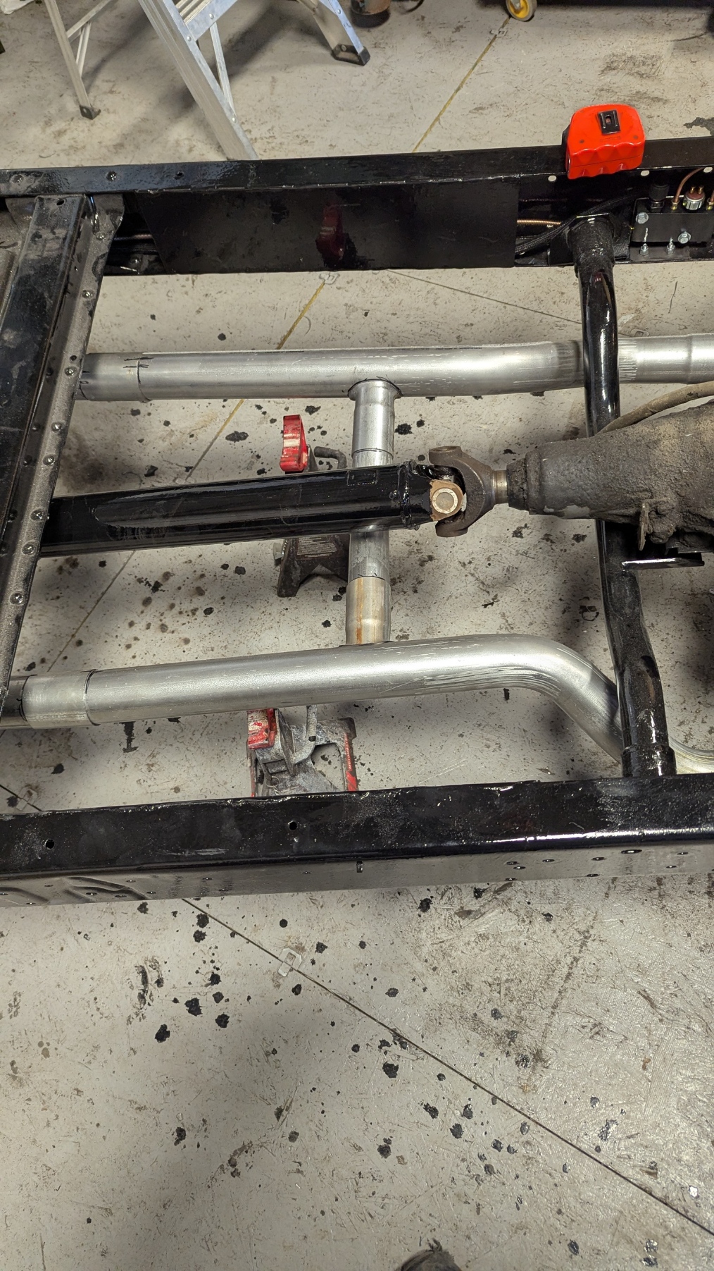 Yesterday was not a real glamorous day as I was cleaning the Frame and Differential to get them ready for painting. Differential had a oily/greasy and scaly rust on it. Lots of scrubbing and scrapping to get it ready. Came in the next day and everything was clean and dry. Flipped the frame and wiped things down and ready for paint. I painted everything that I could see from the Bottom. Differential got painted top and bottom as I was able to rotate it by having the jack stands at the end. I can paint that area later. I will check everything tomorrow after the paint dries to see if it needs another coat.