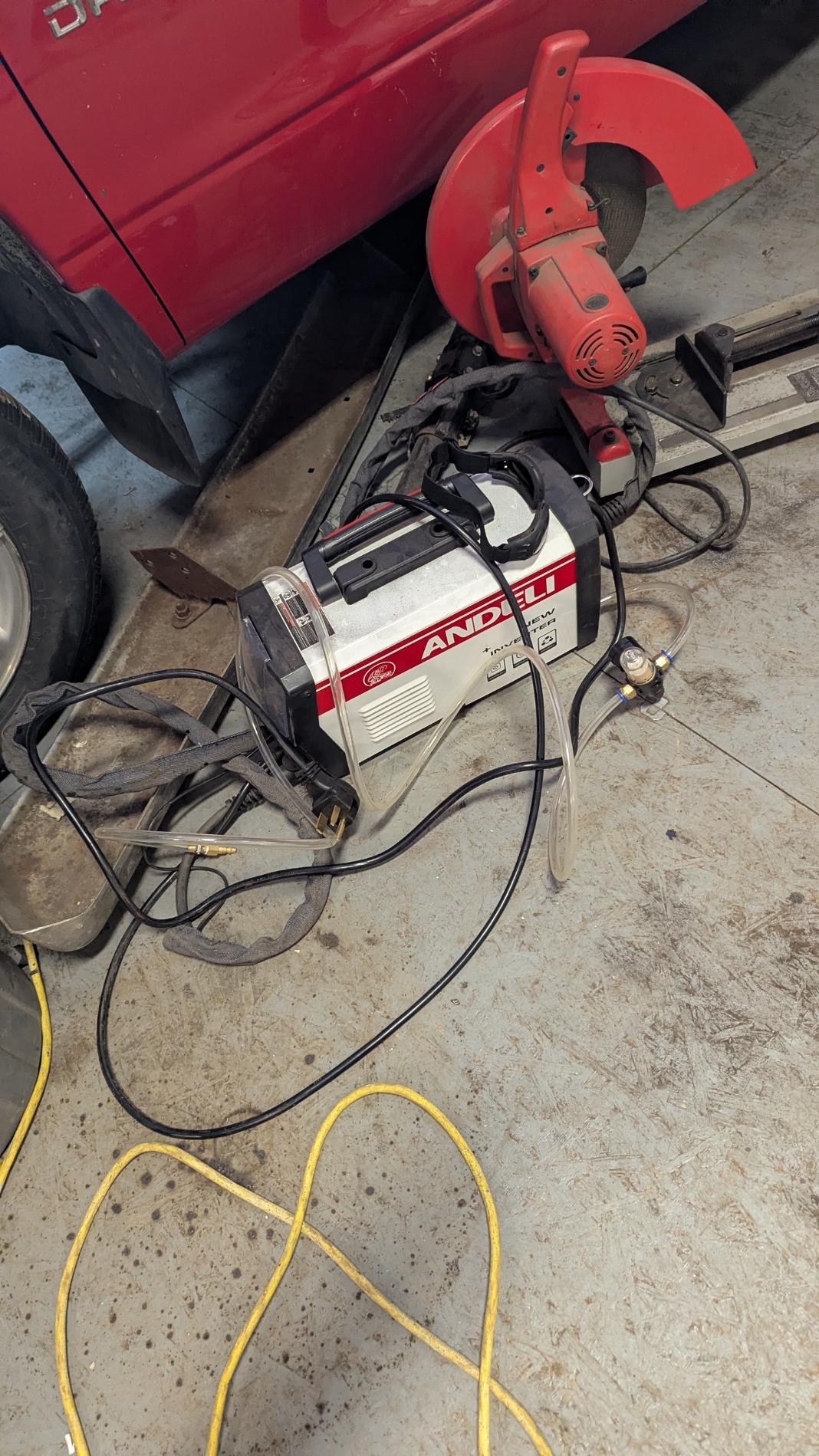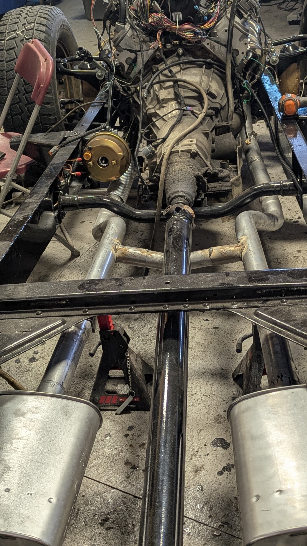 Really quick day at the shop. Murray the owner had arranged to have Dylan drop by the shop and Weld the Mounts and Transmission Crossmember in. I had left the Motor and Transmission in place as I was worried the mounts might move during welding. Dylan assured us this would not be the case. While he was setting up the Motor and Transmission were pulled to provide access to the mounts. Dylan was setup and in short order he had the mounts welded in. Many Thanks for the great service and job well done. Set the motor down on the ground and then left. Now that the mounts are in, the Brake master cylinder can be mounted and brake lines run. NOTE: I had taken some pictures of Dylan in action but somehow the pictures disappeared during the transfer.