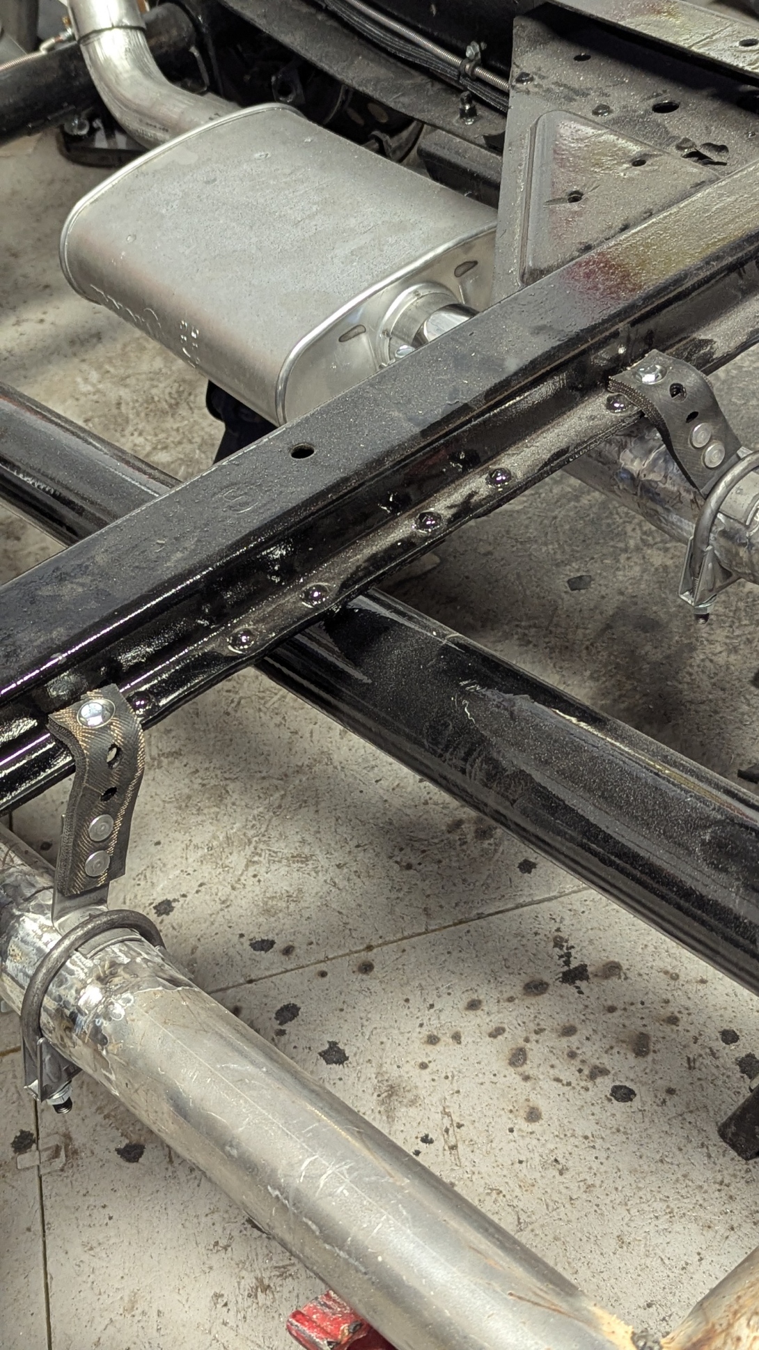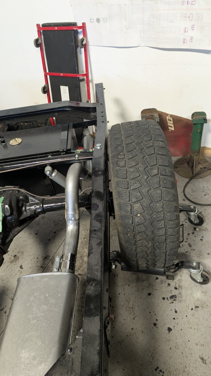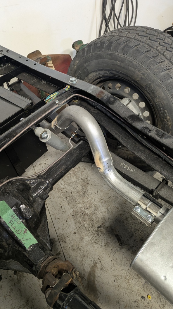 Got in today and finished tacking the tailpipes. Positioned them, tacked them in position and then installed the Rear Hangers and Clamps at the Muffler. Then mounted the Master Cylinder as the frame is now going to the Body shop to fit the Cab. Done with the frame for now.