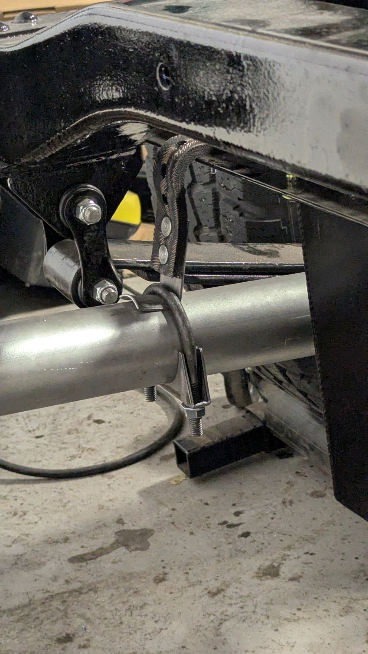 Now the Motor and Trans are mounted, Cab is off and going to the Body shop this week, I can get back to getting items mounted where they belong. Started the Day off with putting the Fuel tank in place and making up the top straps. I had to make a couple of spacers to tank to sit straight but it turned out great. After the Tanks was done (Note Straps need painting before final assembly), I worked on the brake line from the frame to the differential. Made a couple of brackets and tried different configurations to get the best solution. I had to swing it to the front as if I turned it towards the back, I did not fell confident it would not get hit during suspension travel. All good now with lots of travel.
