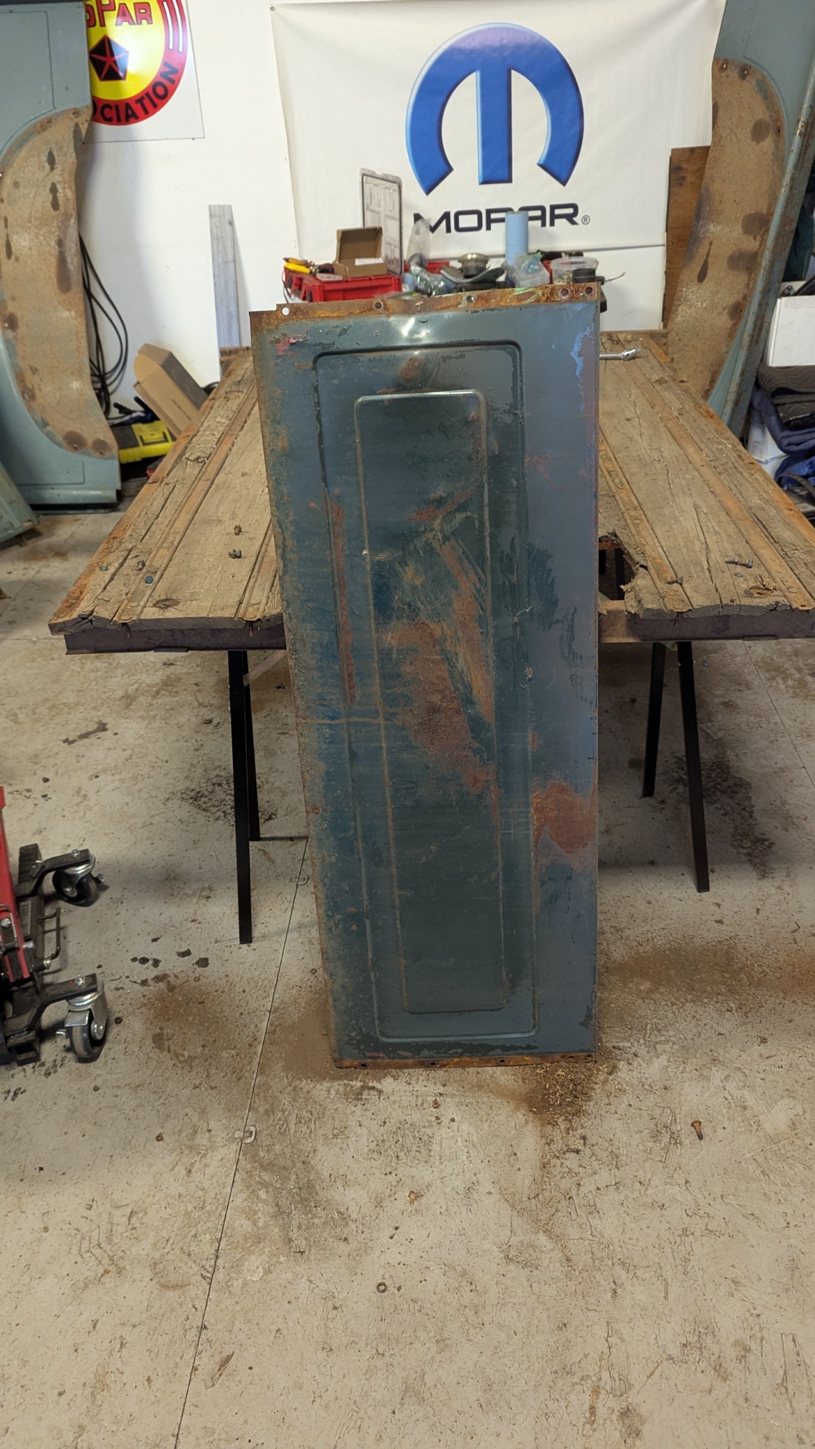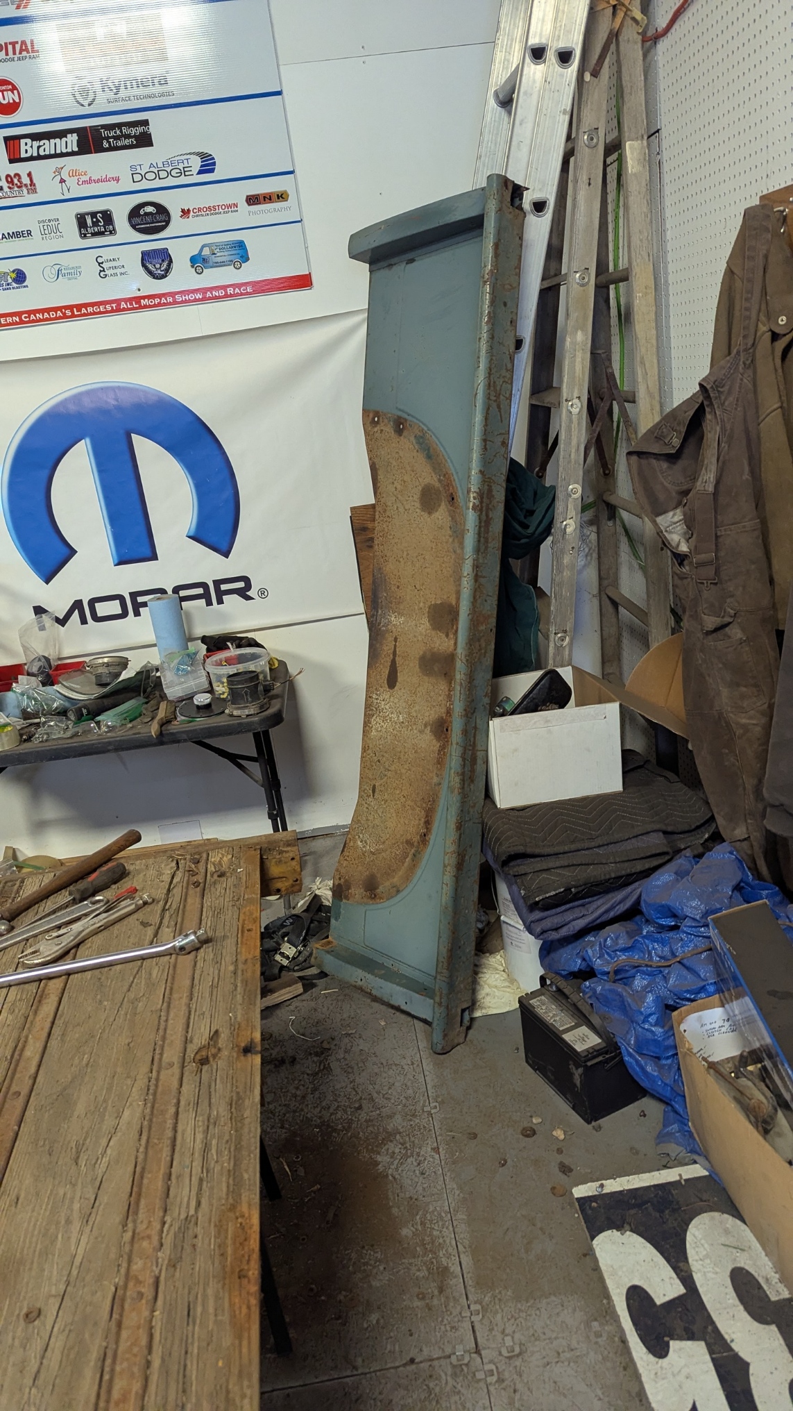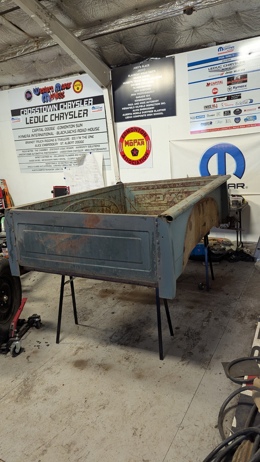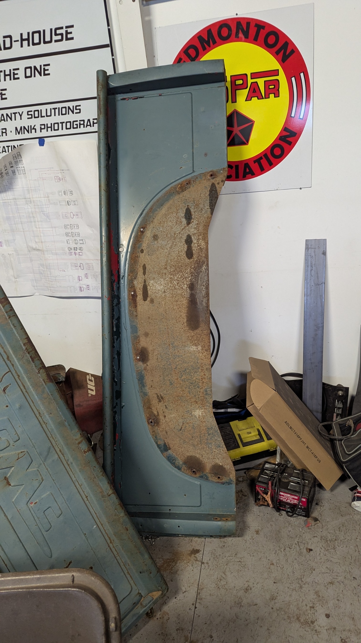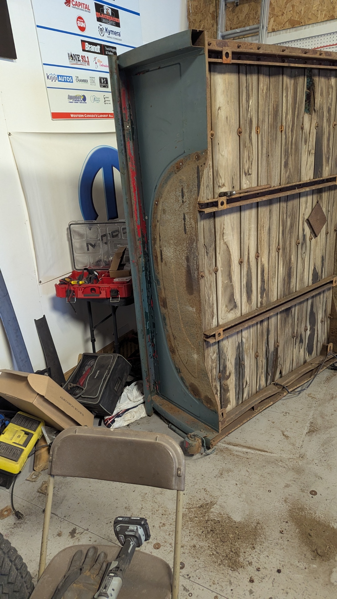 Looked at my next project. Tear the Box apart. Over the last few months, I have been adding Move-it on all the bolts to hopefully ease removal. Started removing the bolts which have large Phillips head and 1/2″ nuts. Well trying to hold it with a large Phillips was impossible BUT found I could grab the heads with a Vise Grip and then hand wrench the nuts off with a ratchet and socket. Took a while but I did manage to remove all the bolts to get the fenders off. I thought more would break but only two broke. I have to bring my saw horses from home so I can get the box to flat and up in the air. Another day !!