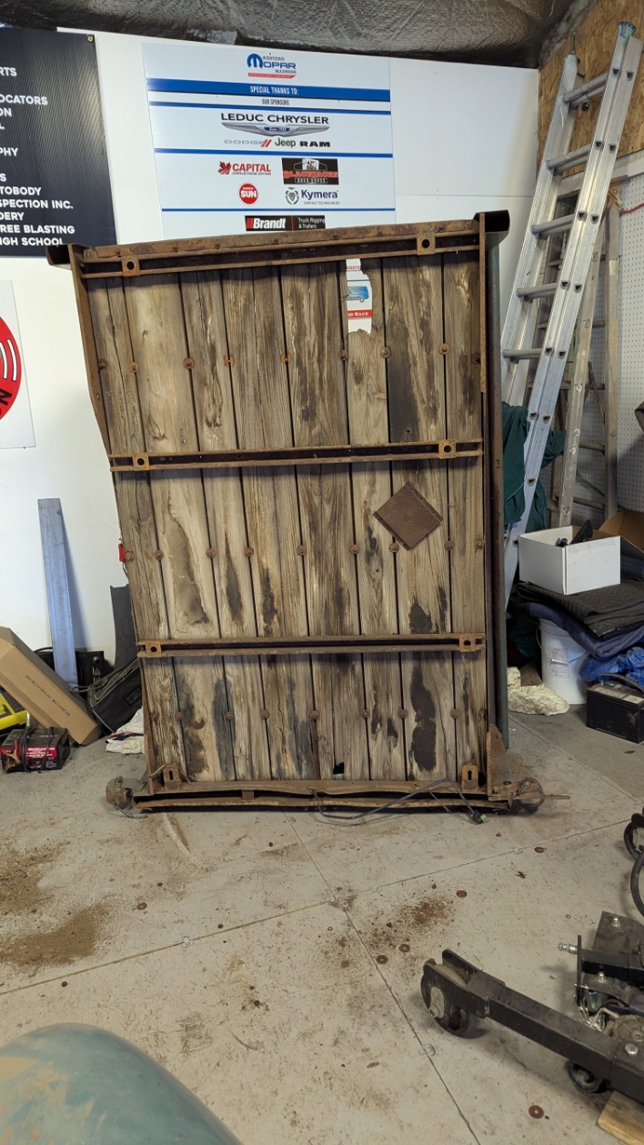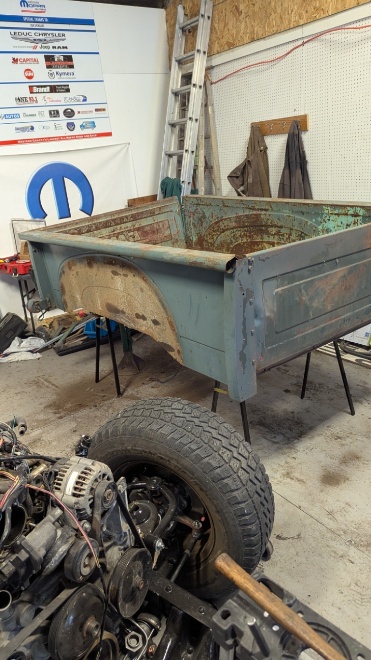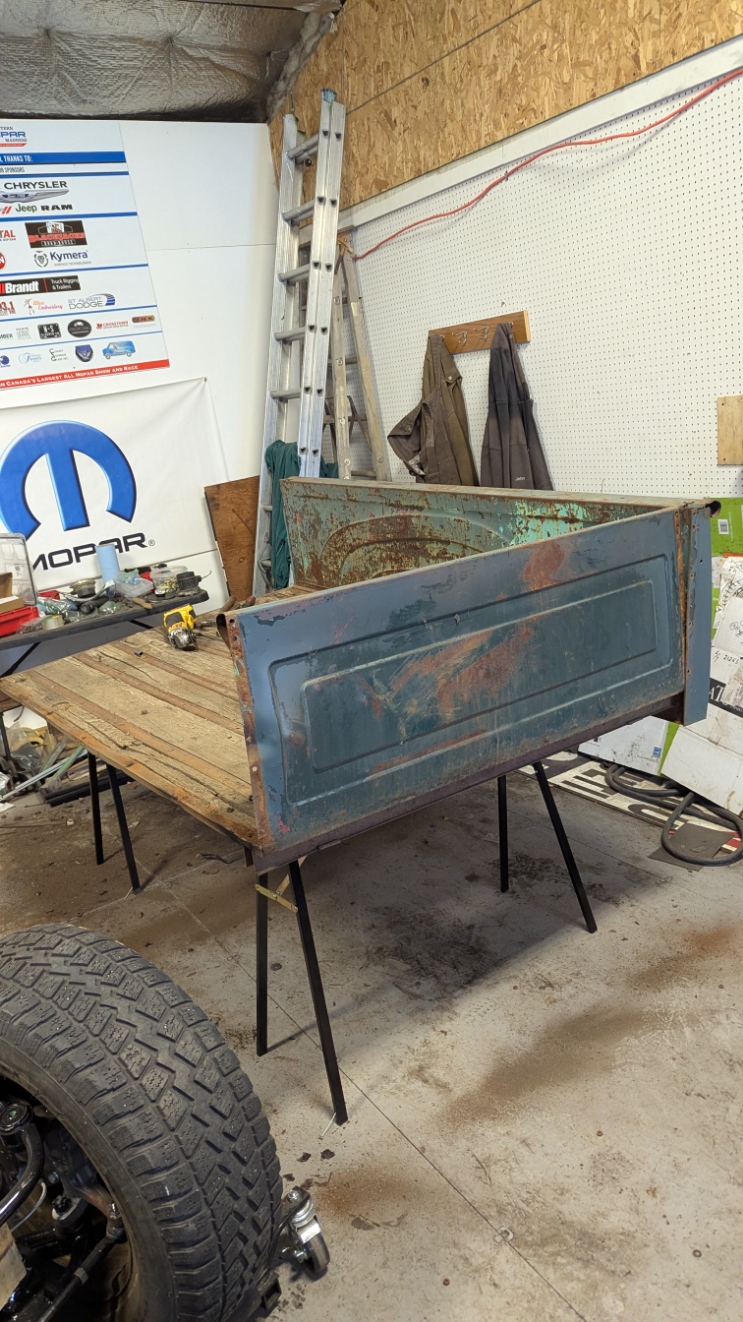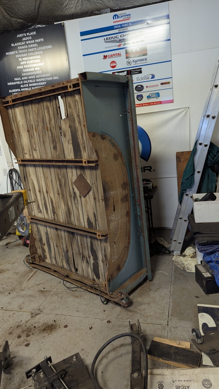Well I came in and thought this was going to be a battle of rusted bolts that I would be fighting with to get apart. However with the Magic of Grinders, Impact gun and Plasma Cutter, it really went easily. I had already removed the Fenders so I looked which bolts needed to removed. None would come apart with the Impact gun so out came the Plasma Cutter. No problem getting them to separate. Cut all the bolts that held the box side to the box floor. Lowered the box onto Saw Horses so it would allow me to access things from the top and bottom. There were 5 bolts on each front corners and 3 to 5 bolts on the back lower corners. Took the End gate off first which I needed to cut one bolt and it was off. Then removed all the front bolts EXCEPT one at each top corner. Then I tackled the back which needed some bolt heads to be ground off. Some came out with the Impact gun and Wrench. Once the back bolts were all out I had to look how it was held together. Found out the side slid over the end of the last box rail. Took the last front bolt out of the side I was going to remove and slid it apart. Then the other side was similar except required a little more persuasion to get things apart. The Front just had to be slid down off the bolts and it was off. The floor of the box is basically junk as all the cross bars are bent and the wood hold down straps are warped. This truck seemed to have a hard life. The front of the Box and End gate will need to be replaced as well. The side are in decent shape.