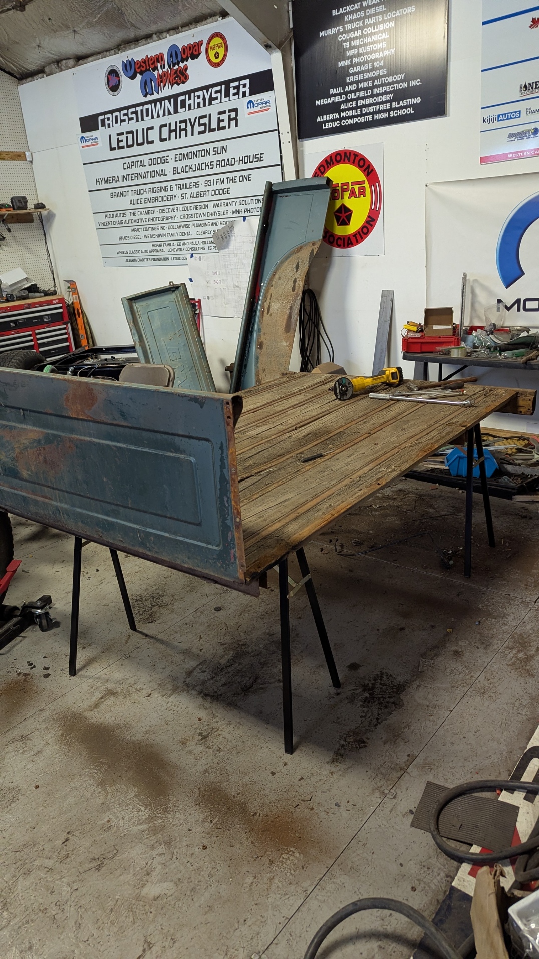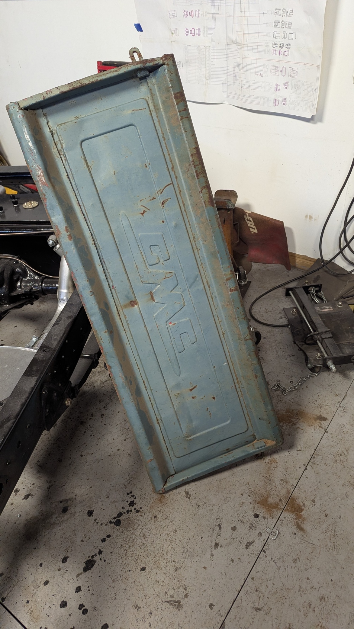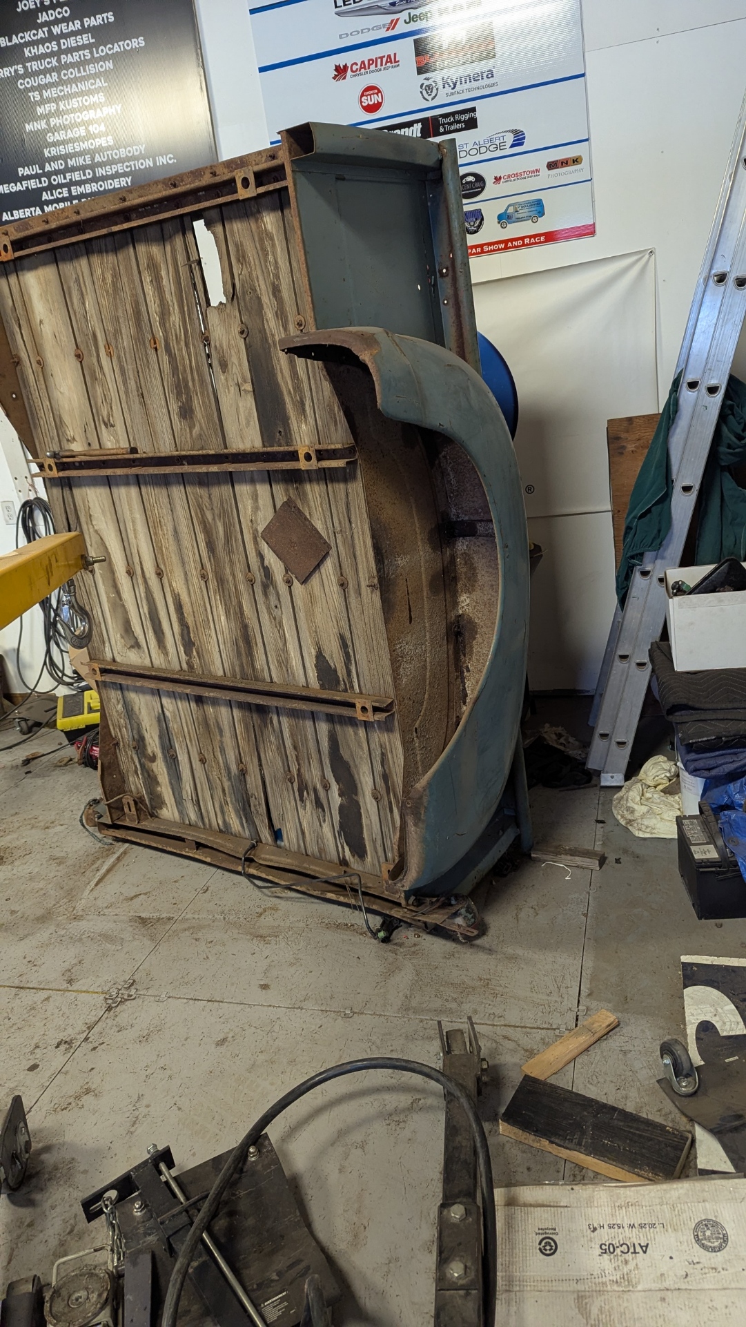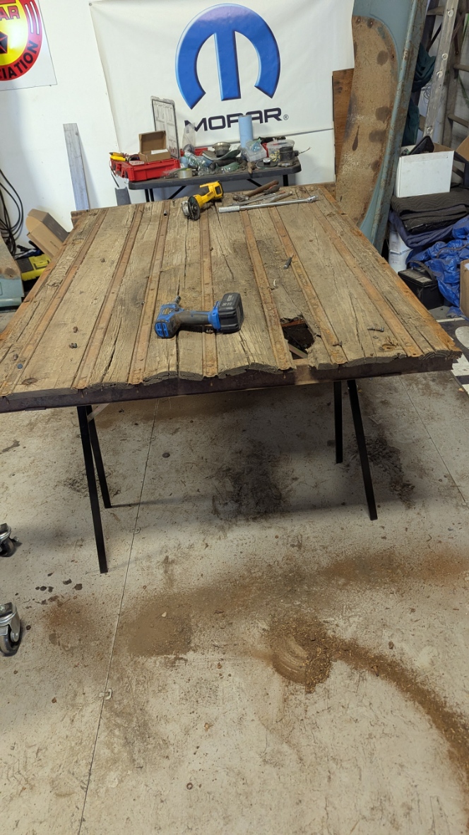 Well I came in and thought this was going to be a battle of rusted bolts that I would be fighting with to get apart. However with the Magic of Grinders, Impact gun and Plasma Cutter, it really went easily. I had already removed the Fenders so I looked which bolts needed to removed. None would come apart with the Impact gun so out came the Plasma Cutter. No problem getting them to separate. Cut all the bolts that held the box side to the box floor. Lowered the box onto Saw Horses so it would allow me to access things from the top and bottom. There were 5 bolts on each front corners and 3 to 5 bolts on the back lower corners. Took the End gate off first which I needed to cut one bolt and it was off. Then removed all the front bolts EXCEPT one at each top corner. Then I tackled the back which needed some bolt heads to be ground off. Some came out with the Impact gun and Wrench. Once the back bolts were all out I had to look how it was held together. Found out the side slid over the end of the last box rail. Took the last front bolt out of the side I was going to remove and slid it apart. Then the other side was similar except required a little more persuasion to get things apart. The Front just had to be slid down off the bolts and it was off. The floor of the box is basically junk as all the cross bars are bent and the wood hold down straps are warped. This truck seemed to have a hard life. The front of the Box and End gate will need to be replaced as well. The side are in decent shape.