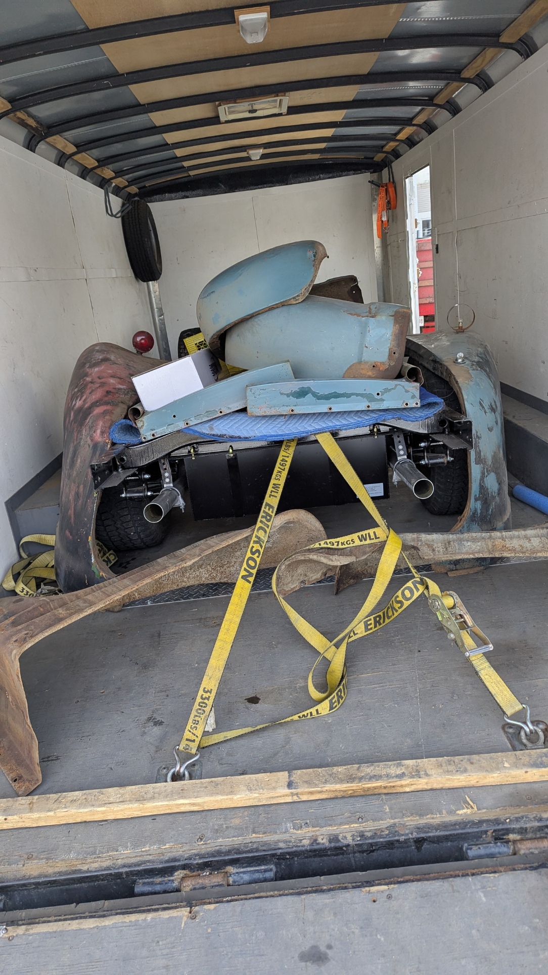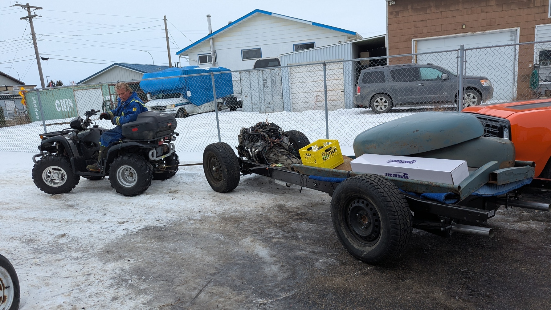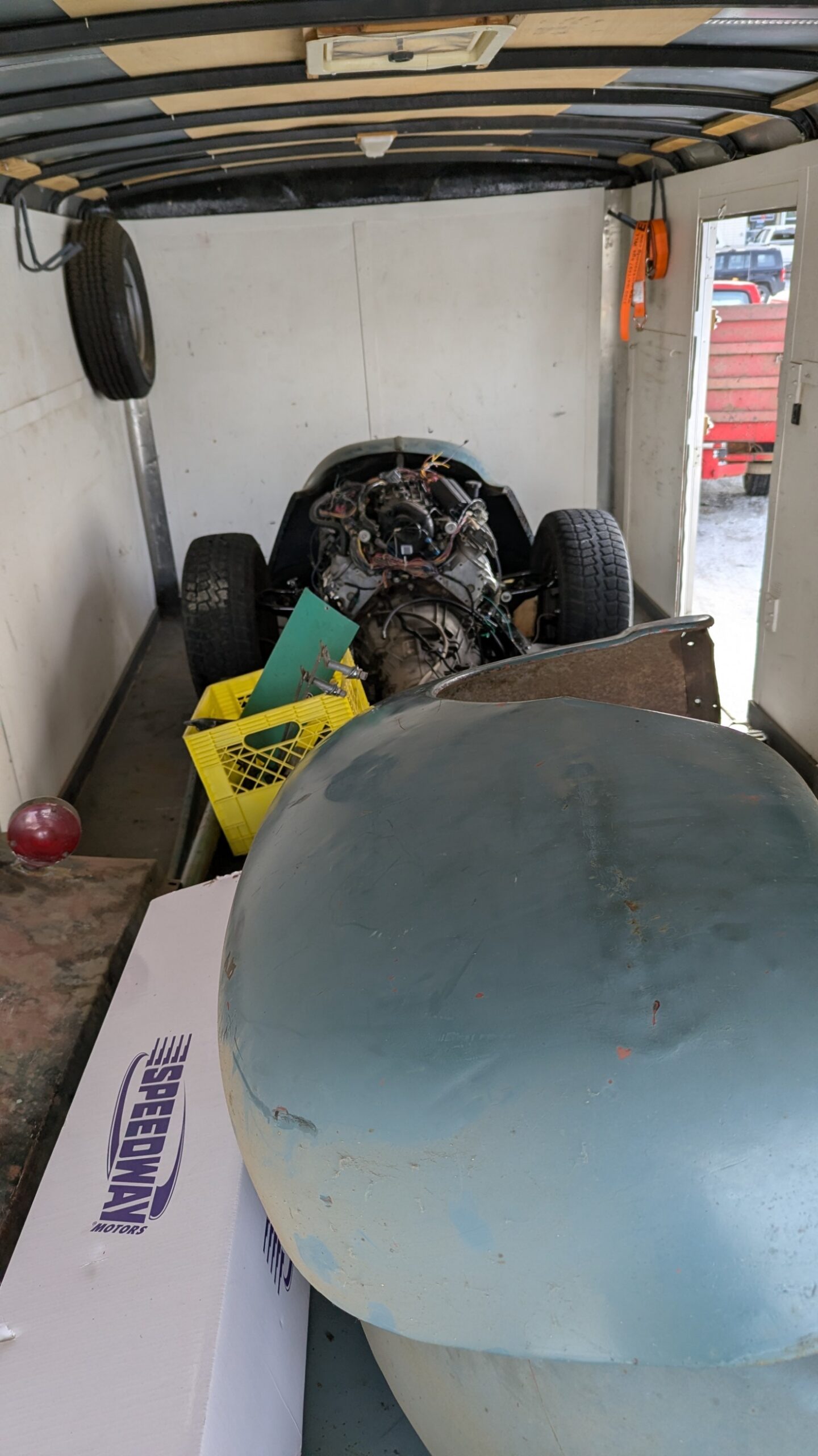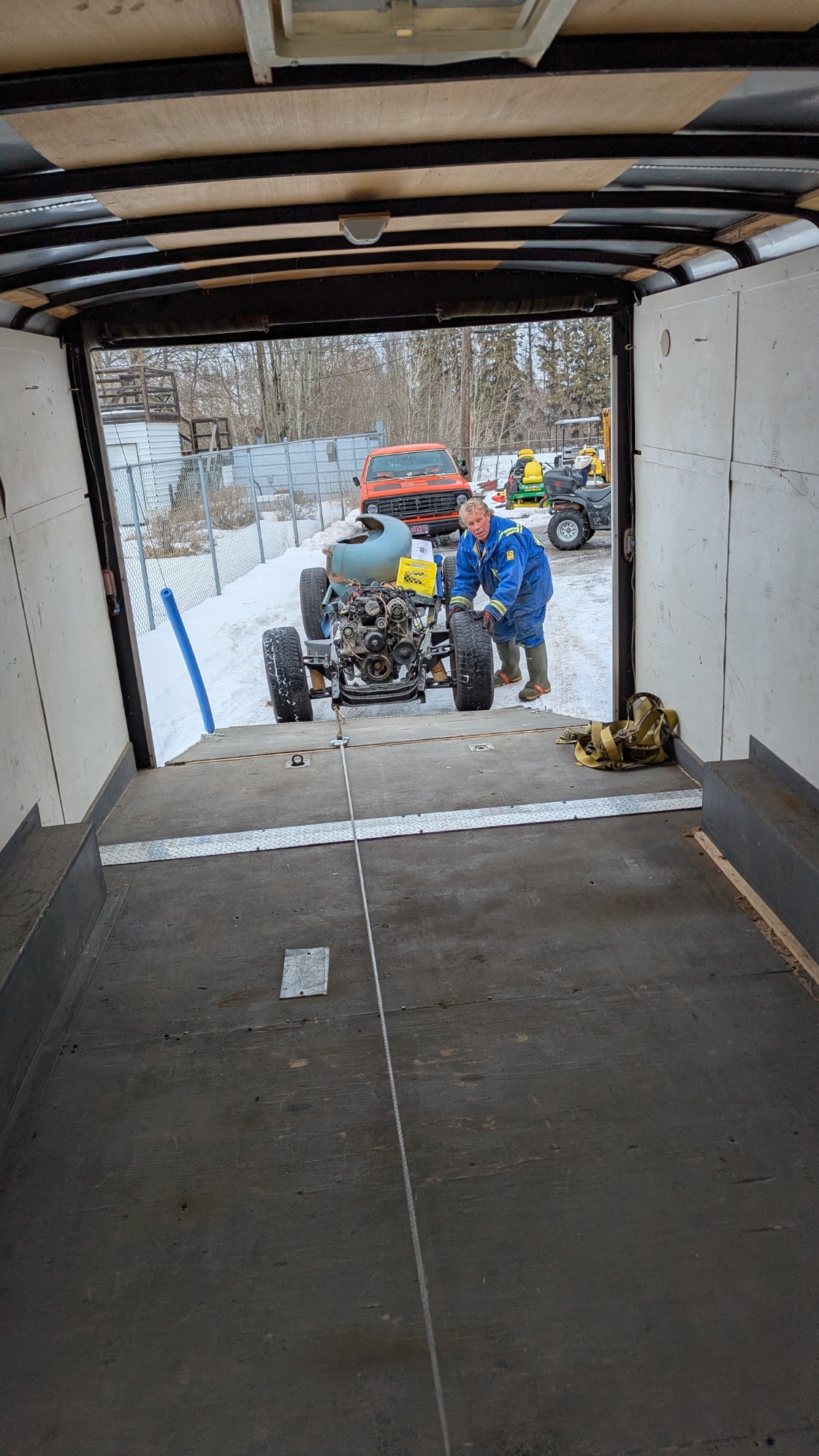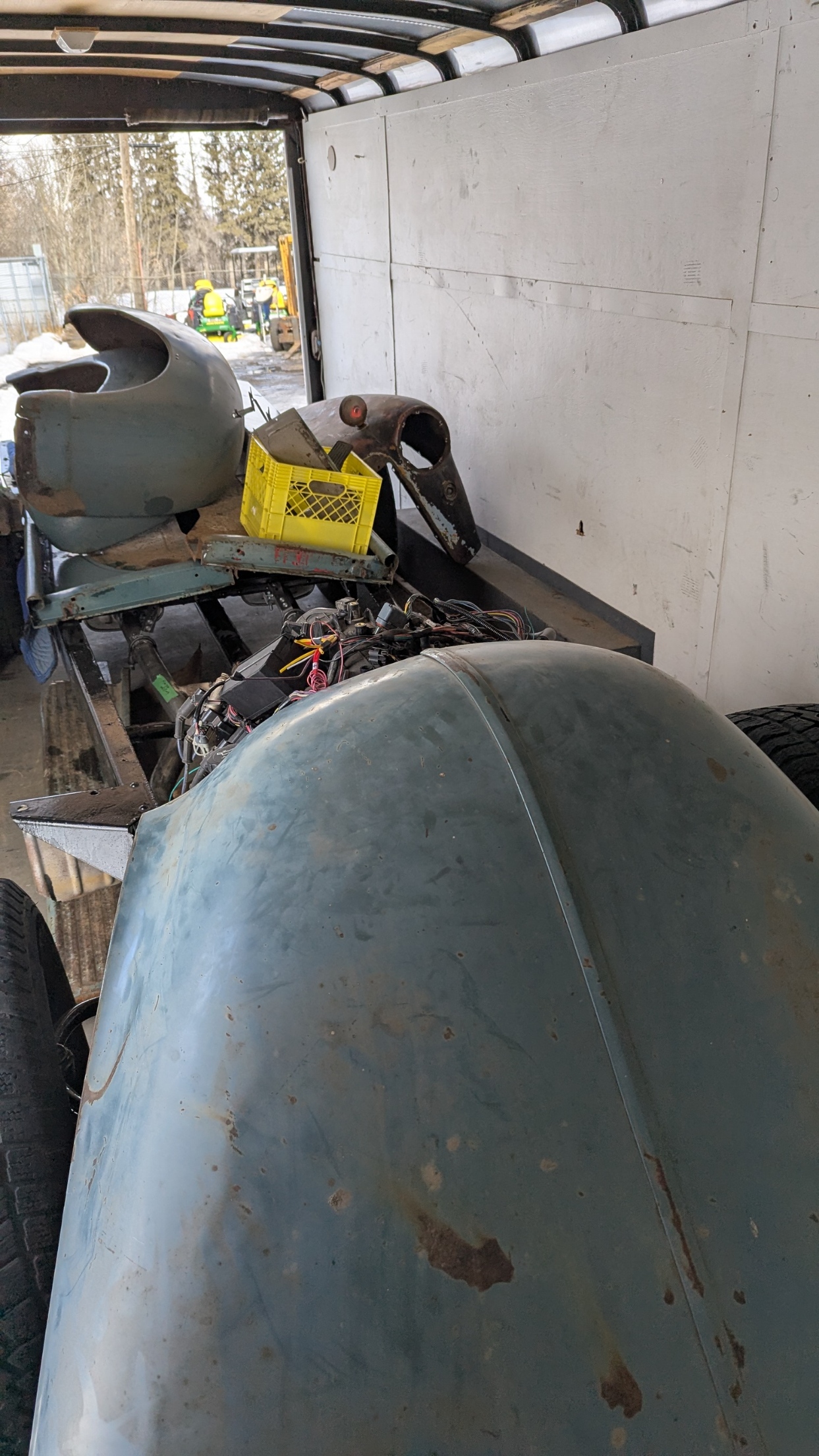The frame will be needed at the Body shop so today the frame was moved out of the shop to the Trailer. In the trailer was my Truck that went into the shop. It went surprisingly easy as we had the availability of the use of a Quad from Devon Small Engines. My Truck was taken out of the trailer and then the frame was pulled out. Once it was close enough, I hooked up the winch and sucked the frame into the trailer. Then we pulled my Truck into the shop. Murray and Nicole arrived and we pushed my truck into position in the shop. They helped load all the body panels into the trailer as well. strapped things down and closed up the trailer. I will wait for the body shop to request when they need the frame. I am bringing all the body panels so they can look at which can be saved and which will need replacement.